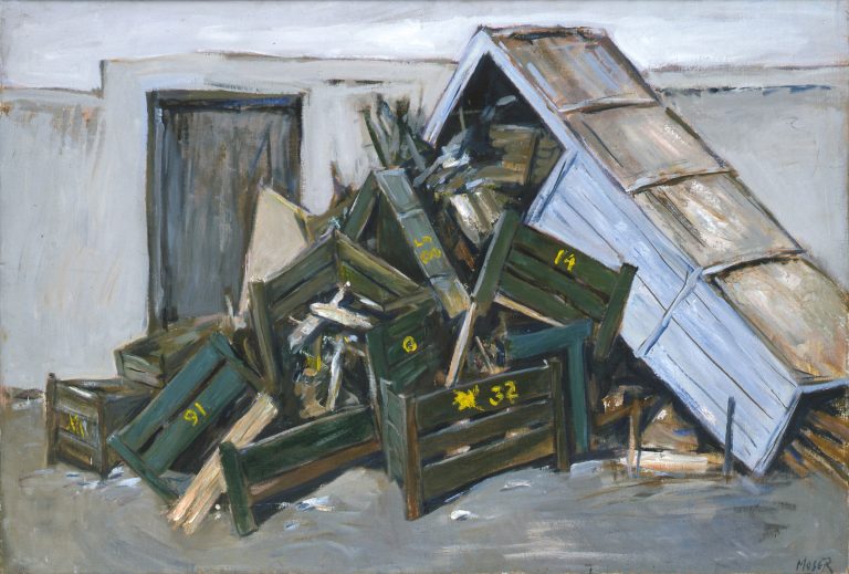 Ses œuvres, que l’on pourrait qualifier d’expressionnistes, oscillent entre réalisme et abstraction. Elles sont fortement influencées par l’intensité des expériences parisiennes : enfilades de rues, maisons closes, boucheries, métros et ponts. Il retranscrit cette énergie dans une incroyable variété de supports : ses peintures parsemées de collages, ses sculptures synthétiques rayées de rouge et blanc ou encore, ses paysages de montagne aux nuances de gris. Après Hodler et Kirchner, Moser ouvre un nouveau chapitre de la peinture de montagne dans l’art suisse. Le travail de Wilfrid Moser est présent dans des collections publiques importantes et, en 2009, la Kunstmuseum de Berne lui consacre une grande rétrospective. À l’occasion du Centenaire de la naissance de Wilfrid Moser en 2014, la galerie organise l’exposition « Moser, l’insoumis, sur les traces du piéton du petit matin » avec le soutien de la Fondation éponyme à Zurich. Cette exposition, présentant peintures, sculptures et dessins, offre un panorama rétrospectif de son œuvre attestant de l’originalité de Moser dans l’art d’après-guerre.